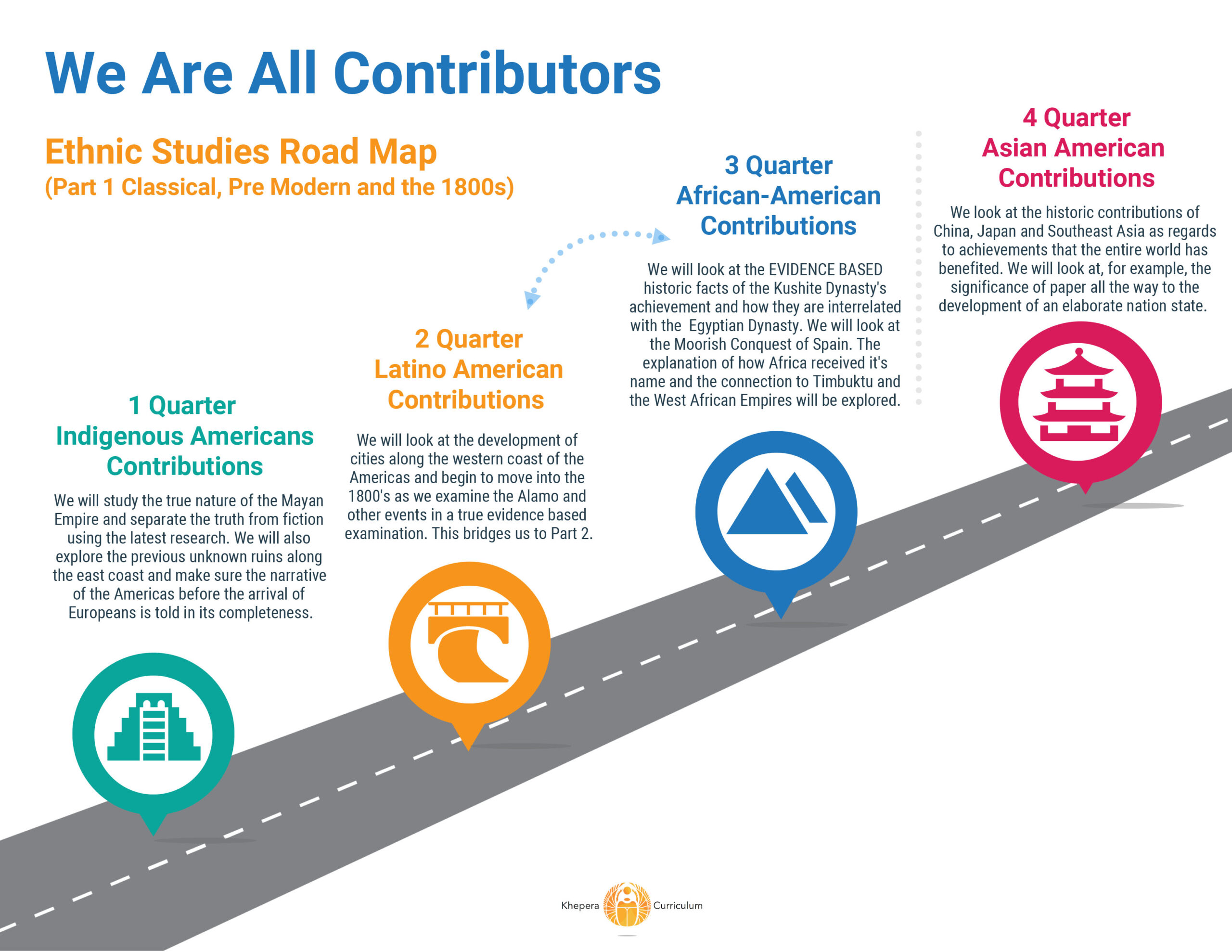 WE ARE ALL CONTRIBUTORS is an Ethnic Studies curriculum that focuses on the unique contributions to humanity that each ethnic group's ancestors have made. These series of courses demonstrate we are all a part of one human race that has constantly borrowed and elevated ideas and knowledge from one another. No one ethnic group is solely responsible for the development of the world we share today. Many curricula focus on the oppression of Europeans, this curriculum does not do that and instead focuses first on the genius within us all.